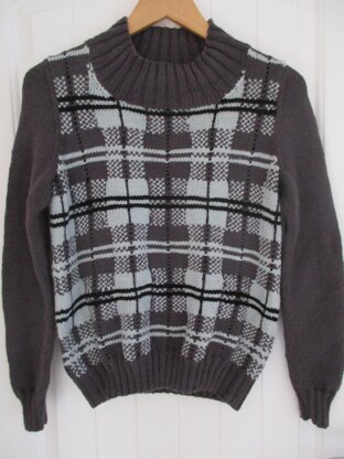 This is a pattern for a Plaid Jumper, originally published in Knitting magazine, It has a pattern on the front and back, plain sleeves and ribbed edges. The pattern is a mix of intarsia and fairisle.