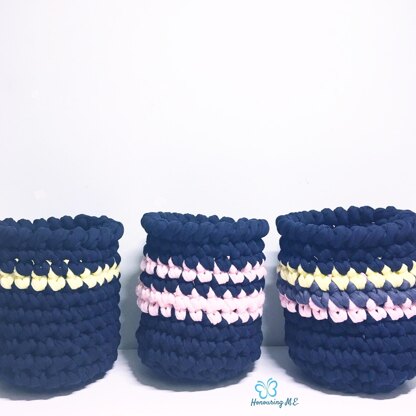 These baskets were designed for my beginner series workshops that are coming out soon! There are four variations included in the pattern - a plain one (not pictured) and the 3 that are pictured. These baskets are made from t-shirt yarn, use a 12mm hook and are perfect for holding an empty 800g can of tomatoes - which means you can use them to house a small plant or utensils in style! A perfect handmade gift too. And let's not forget the benefits to the environment...upcycling of t-shirt material as well as cans from cooking!