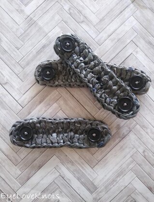Materials You'll Need: 13 1" Strips - I find this takes 1 - 2 bags, K10.5/6.5mm Crochet Hook, Tapestry Needle for Weaving in Ends, 2 5/8" - 1" Size Buttons and Sewing Thread with ThreadMaterial Note: The best option for thread is silamide thread. This is a durable, waxy 2-ply nylon thread. Time Spent: 15 MinutesAbbreviation to Know: HDC - Half Double Crochet