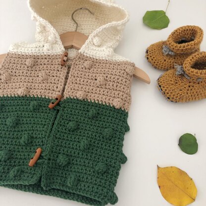 The Play all Day Vest pattern is designed to fit 0 - 2 year olds, in 5 separate sizes, and is a unisex pattern. The pompoms are fun for baby to play with even when its nap time!