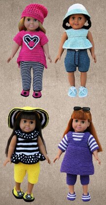 Four separate outfits, each with shoes and 3 with hats. Three are made from Sinfonia sport weight cotton, the other from worsted weight acrylic.