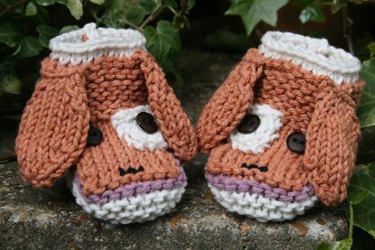 These playful puppy booties are just so cute and babies would love a little pet on their feet! This is a detailed knitting pattern with row by row written instructions and photographs. The booties are knit flat on two needles using Aran weight yarn. The ears and eye patch are knit separately and sewn to booties upon completion, the nose is embroidered using Swiss Darning (duplicate stitch) over two stitches and the eyes are buttons sewn securely to the booties.