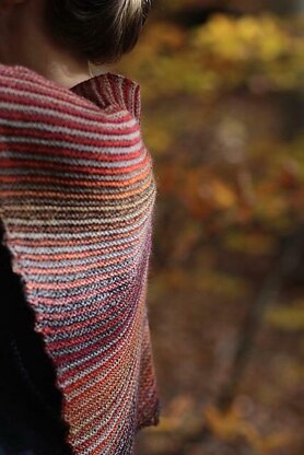 This striped garter triangle is designed to be easy and flexible enough to knit on the go without having to refer to a pattern. The 'gap' detail at one edge of the triangle forms an interesting variation in the stripes, or a subtle boat neck collar, depending on how it is worn.