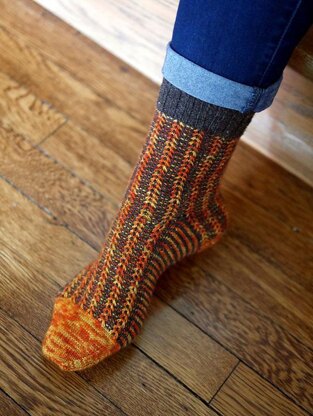 This handsome sock in five sizes (XS/S/M/L/XL) features a vertical slip-stitch pattern that mixes two highly contrasting yarns nicely. This is a great way to use yarns of differing characteristics as well, such as a springy, wooly type with a slippery, shiny type to make a suitably sturdy sock fabric. This version pairs a highly variegated hand-dyed yarn with a solid, natural shade but a more subtle fabric can be achieved with two solids that are closer in tone. The patterned portion extends down the leg and heel, as well as over the top of the foot; the toe and top cuff are worked solid.