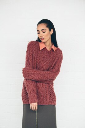 Cosy sweater with all over lace and cable patterning. Wide neck and optional vents at sides.