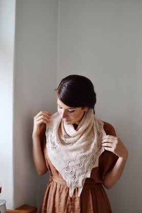 Plume (feather in French) was inspired by the soft and gentle colour that was sent to me for this design. It was a completed surprise and a pure delight. I didn’t want to use any complicated stitch for this base that is as light as a feather, so I decided to go ahead and play with garter stitch, some simple lace, and a few Estonian braids.