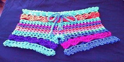Pattern is written for short shorts. Add more rounds of dc, ch1 mesh to add length to the legs. Finished Measurements 1X hips 48 inches 2X hips 52 inches 3X hips 56 inches 4X hips 60 inches