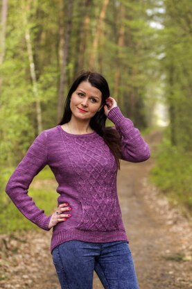 “Pocket you, Kangaroo!” has the casual looks that make you fit in when hiking or attending games, but still gives you the gratifying comfort of a garment tailored exclusively to your unique body shape.Seamlessly constructed, this sweater has all the extra little details that provide welcome diversion during knitting and instantly show the adept viewer what an accomplished crafter you are. It has a beautiful cable panel with texture-filled argyle shapes on the front and optically slimming vertical lines on the back, a rounded neckline just deep enough to show off a pretty necklace or cleverly draped neckerchief, and snug-fitting ribbed cuffs that safely keep out wind and cold. The same ribbing is repeated at the shirt tail hemline. Best of all is the incorporated kangaroo pocket where you can keep your hands warm or carry small items.