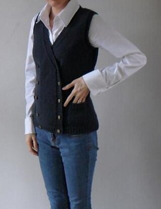 The vest is knit from the bottom up in pieces. It is designed to fit with 0-3" of positive ease, and is fitted at the waist. It is shown in the 33" size.