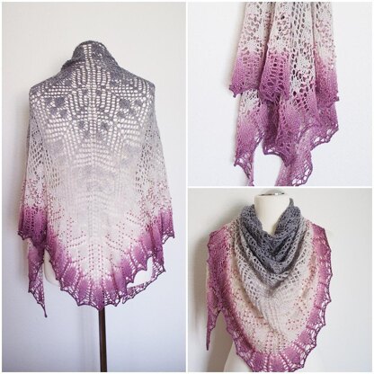Details to the shawl on the picture: Yarn: 600m/150g Gradient Yarn Merino/Silk, color ‘Cassis’ 4.0mm (US 6) needle