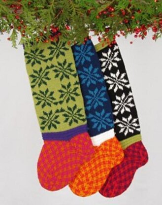 Pattern provides clear written instructions, along with color charts for each colorwary, to knit a Christmas stocking in the round.