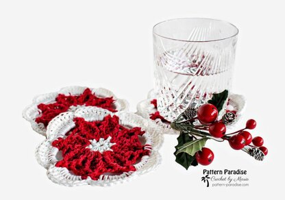 These pretty poinsettia’s add a bit of festive cheer to your holiday table. They are perfect as individual coasters, but if you join several together they would make a lovely table runner or placemat as well! I love the elegant shaping of the poinsettia leaves and the scalloped edging too.