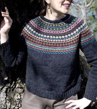 Reminiscent of the colors in an old Polaroid picture, this yoked sweater is a classic piece worked in the round from the top town. Brooklyn Tweed’s Loft yarn creates the perfect palette and provides the crisp detail that makes for a great colorwork sweater. An uncolored chart is included in the pattern if you’d like to create your own custom palette.
