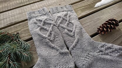 Knitted cuff down, the cables on the leg form the head of a wolf. The sock also features a short row heel and a smaller wolf head on the foot.
