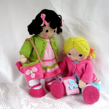 KNITTING PATTERN contains instructions for Polly and Kate dolls which are made from the same basic pattern. Instructions are given for the knitted dresses, skirt, cardigan, bags and headband plus fabric skirt. Shoes are not removable