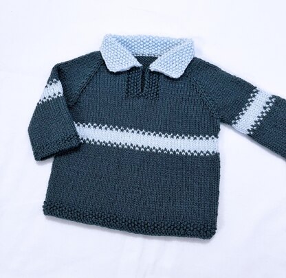 This is a baby boy polo-jumper with collar and light blue stripe on the body and sleeves. Initially, the jumper is knitted flat (back and forth) and later it is joined in the round. The sweater is worked top down with raglan sleeves and no seam required. Part of the front piece is open to allow easy dressing. The stripes are knitted using a Fair Isle (stranded color work) technique.