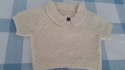 It is knitted with garter stitch welts and cuffs and an effective double moss stitch pattern. The collar and button detailing are knitted in garter stitch to correspond with welts and cuffs.