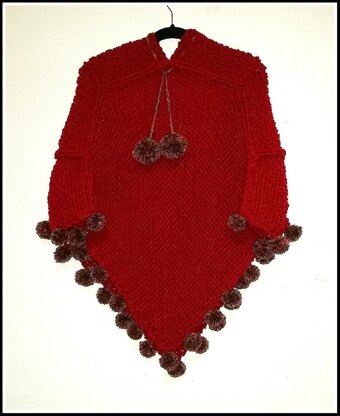 This poncho is simple to make using approx 6/7 balls of super chunky yarn and approx one ball of super chunky mosaic for the pom poms and tie.