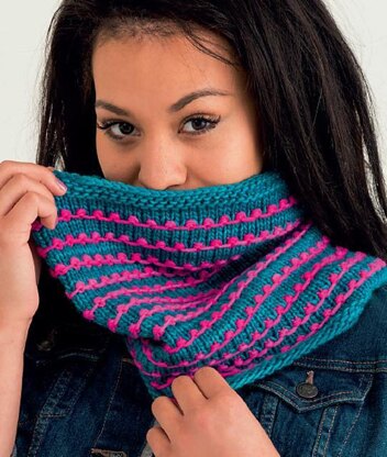 There are so many directions you can go with the yarn you’re using for this pattern. Consider working Color B in a gradient or self-striping yarn. You can even make this cowl with leftover yarn – mix and match those leftover worsted-weight yarns to create something really unique! Grab a solid color yarn for Color A and use your leftovers for the contrasting Color B. If you’re mixing and matching your worsted weight yarns, each mini bobble stripe uses approximately 7 (14) yards of yarn to complete the two rounds in Color B.