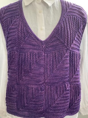 The beauty of knitting miter squares is that you pick up and cast on as you go. There are no seams in the fabric of this vest. It is worked flat with the only seams at the shoulders and a seam at the front for a pullover vest. It can also be made as a cardigan vest by adding button bands on the fronts. Each Miter Square is CO as one piece and knit with a double decrease on the 3 center sts and a garter ridge every 4th row.