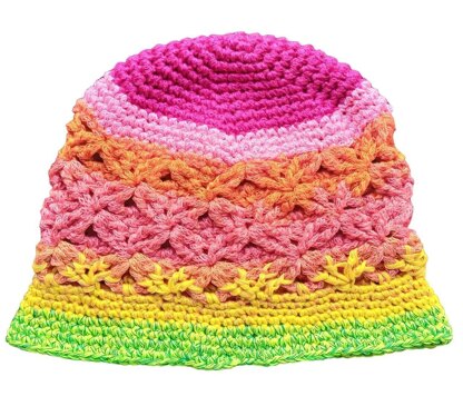 "Poppins Hat" is bucket style hat with a lovely floral pattern. It is inspired by my “Ixora Bag” pattern. The hat features a simple base, a lacy floral design in the center, a brim and buttons.