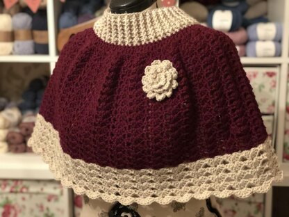 Lovely vintage style capelet with flower detailing. Using 2 shades of yarn makes it a gorgeous statement piece. Using fan stitch pattern detailing.