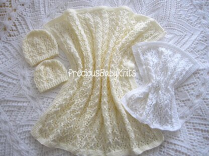 This pattern contains intructions for a pram blanket ( 28" x 30" ) , a doll's blanket ( 14" x 16" ) and 2 hats ( 12" and 15" circumference )