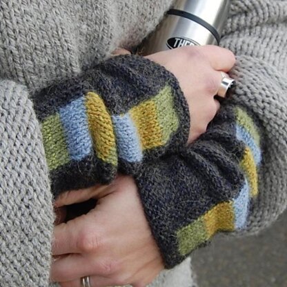 Simple wristees, lit up with with blocks of colour. They are worked flat and finished seamed or seamless, as you prefer. There are some stitches to pick-up, but the colourwork is all simple stripes, no intarsia. Designed to help use-up the beautiful contrast colours. For up to 5 blocks/17cm/7” long, allow 1 skein x main colour (A). For longer wristees, allow 2 skeins x A. Allow 7-15m/8-17yds each of 3 contrast colours, (B, C & D). Sample used: 60g/120m/132yds of Licorice (A), 10m/11yds of Relish (B), 7m/8yds each Blue Cheese (C) & Dijon (D).