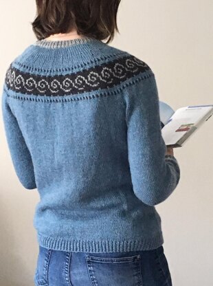 This relaxed sweater features a circular yoke with colours reminiscent of Porthpean beach in Cornwall. It’s worked seamlessly in the round from the top down, so the finishing process is minimal. A series of short rows before the colourwork raise the back of the neck. The waist shaping is optional and the sleeve length is adjustable.