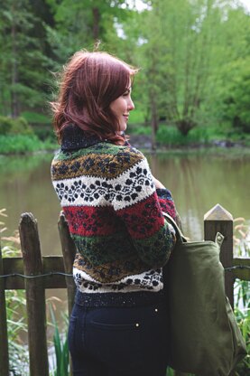 The really strong scroll pattern in bands of colour on this sweater has a special feature: it carries across the sleeves to give it even more impact. It was knitted in Rowan Tweed, but Rowan Felted Tweed is a suitable alternative. The polo neck, cuffs and hem are in simple rib.