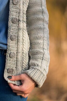 This cardigan is worked top down with set-in sleeves, starting at the back, followed by both fronts and parts joined after the armholes, with button bands featuring a one-row buttonhole.