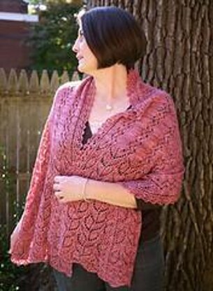 A pretty rectangle in three sizes (scarf/petite/tall), worked in a vertical composition of delicate pea vines dotted with nupps (add or substitute beads if desired). Piece is worked from hem to center back in two pieces, then grafted afterward. Despite its intricate appearance, this piece travels well and knits up quickly to make a special accessory for the gardener in each of us.