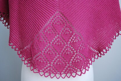 This shawl is knit from the top down, starting with a garter tab. The lace inset is both written and charted, and the bottom edge is finished with an easy crocheted edging.