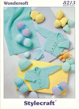 Pram Cardigans, Blanket, Hat and Mittens Set in Stylecraft Wondersoft DK - 8213 is a Knitting pattern by Stylecraft, available as a Leaflet and includes instructions in English. Super fun to make, this pattern could be your next masterpiece!