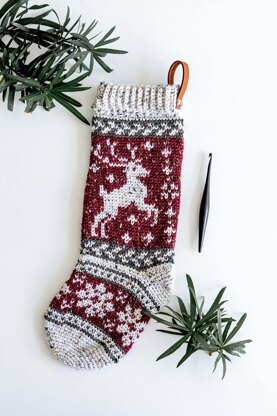 The Prancing Deer Crochet Stocking is available as part of the course "Briana K & Marly Bird’s Prancing Through The Holidays Make Along", but is available for individual purchase as well.
