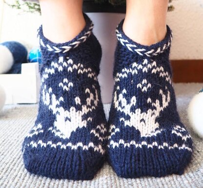 The slippers are knitted flat for the heel and then joined in the round for the rest of the foot. The toe is grafted with Kitchener stitch; both parts of the heel are joined with mattress stitch.