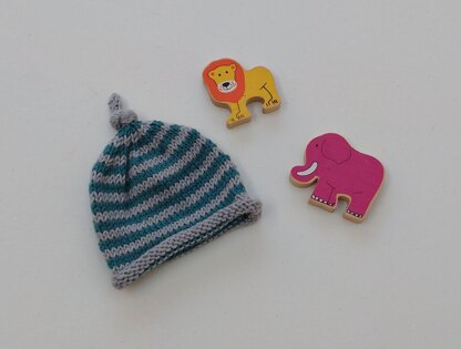 This pattern is a scaled down version of my Top Knot baby beanie pattern to fit premature babies from 3-5lbs in weight. It takes small amounts of yarn and looks lovely whether knitted in stripes or a plain colour and is a quick knit too. If making a stripy beanie you will need just over half of the stated yarn in your main colour and the rest in a contrast colour.