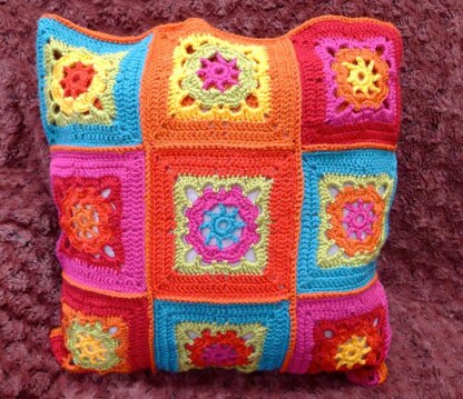 This cushion is made from nine crocheted squares which are a variation of the traditional granny square. I used really bright colours as so many people these days seem to have pale couches and chairs and I thought that the cushion would stand out well and look really bright and cheerful but you could use any combination of colours you prefer. The back is made worked in rows of treble with some bright stripes of colour to the squares.