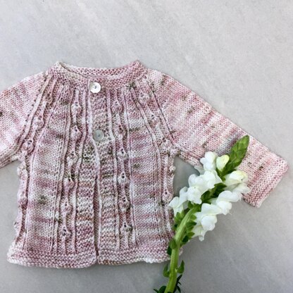 Construction The cardigan is worked seamlessly from the top down, beginning with a raglan yoke. A motif panel is worked down both fronts and along the raglan seams on front and back. Sts are held for sleeves and knitting continues on the body, with wider motif panels extending from underarms to hem. Sleeves are worked in the rnd from the top down.