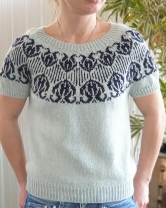 ng flowers, I named this cute tee Primula. Every spring, I look forward to seeing these pretty little flowers pop up in my garden. The tee is made in one piece from top down and has a seamless construction. The range of ease across all the sizes is ­­5-7 cm/2-2.75”. The picture shows size 5 with 6 cm/2.5” of positive ease.