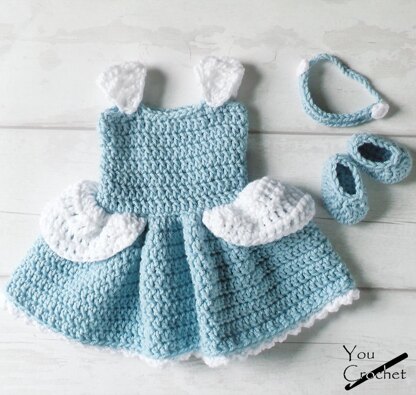Directions for the headband, shoes and dress are included in 3 different sizes.
