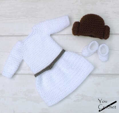 Directions for the hat, boots and dress are included in 3 different sizes.