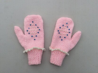 The mittens are knitted flat and seamed. Beads and pearls are used for decoration, but if knitting for small children you may prefer to omit these.