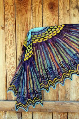 This shawl is a cousin of Royal Peacock. It is knit in three steps. The first is the middle stripe with the feathers, which is worked sideways. Stitches for the top and bottom parts of the shawl are picked up from the sides of the middle stripe. Techniques used: garter, slipped stitches, short rows, decreases/increases. The PDF includes TWO options for the shawl top.