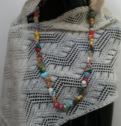 This rectangular lace wrap features a traditional Shetland pattern known as Print ‘o the Wave. It is knit flat and then a narrow eyelet edging – worked in the round – is added. A 2-ply, undyed white Shetland wool yarn is used for this accessory.