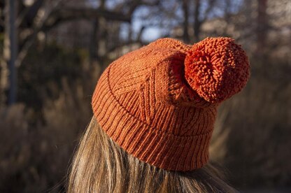 Prism is a striking, textured beanie worked in the round, featuring an allover pattern of diagonal cables and lace that is both graphic and feminine. Details like the tubular cast-on, seamless transitions from ribbing to cables, and hidden crown decreases yield a polished finished accessory. Version A is a close-fitting, modern beanie with a single brim, while Version B has a slouchy fit, a deep, folded brim, and is topped with a jaunty pom-pom.