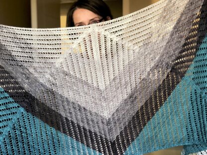 Lines of eyelets emerge at right angles from snaking cables, emphasizing the graceful length of this shawl as a simple gradient triangle using extends into a trapezoid that wraps over the shoulders. On one side, the mini-skeins are reintroduced for a final flutter of narrow stripes. The gradient triangle can be worked with mini skeins or go stash diving for remnants from your favourite projects.