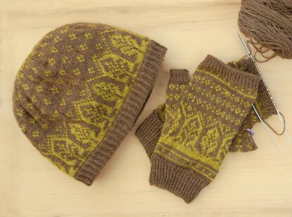This is a pattern for a beanie style hat and a pair of mitts. Both are worked the same, from the rib up and in the round using the stranded colourwork knitting technique. Feel free to make any adjustments as needed, for best fit.