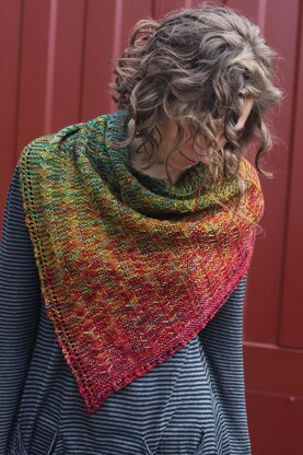 Pteryx is an asymmetric triangle designed to show off a variegated yarn with an engaging combination of garter and stockinette. The name comes from the Archaeopterix, because the stitch pattern resembles the vanes in fossilised feathers.