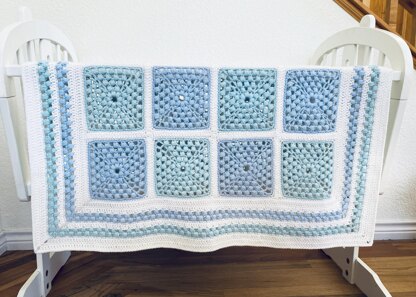 The Puffy Granny Square pattern is a new, textured take, on a classic pattern. The Puff stitch is easy and adds sweet little pillow-like stitches to this lovely baby blanket. The blanket has a generous five inch border, that spotlights your colors and the puff stitches, adding a stunning frame to the squares. The blanket pictured is 35 by 35 inches with worsted weight (size 4, medium) yarn. The size of the blanket is easily altered by the size of the yarn/hook used and the amount of squares worked.